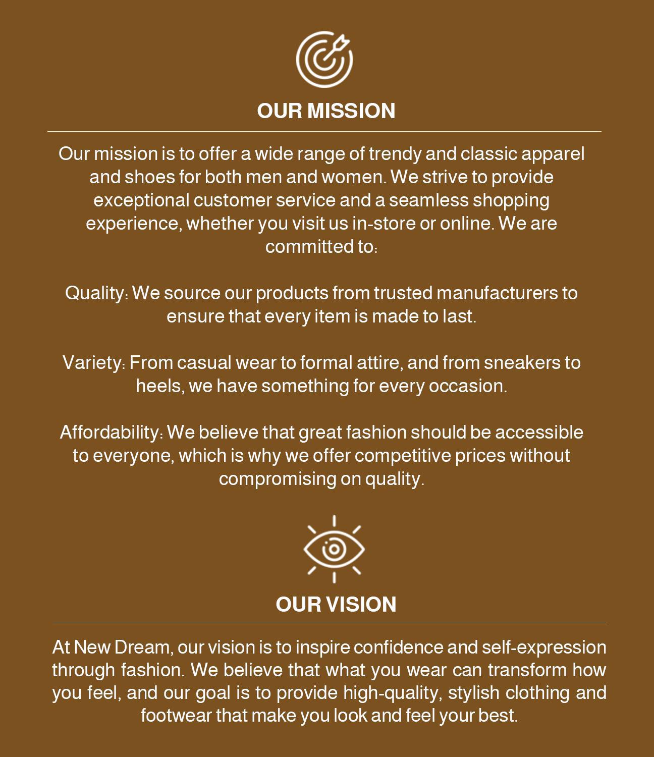 Welcome To New Dream Our store is your ultimate destination for the latest in men’s and women’s fashion and footwear. We pride ourselves on offering a diverse collection that caters to all styles and preferences, ensuring that everyone can find something they love.